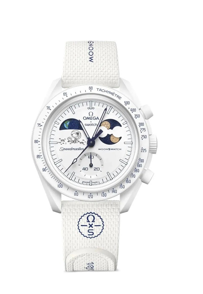 En esta pieza, la esfera en tonos negros y blancos rinde homenaje al icónico Speedmaster que acompañó a la NASA en 1965, evocando un carácter sobrio y atemporal. La correa negra de VELCRO© refuerza su estética funcional y su espíritu espacial. El segundero del cronógrafo, las agujas del contador y los índices destacan por su diseño limpio y contrastante, inspirado en los modelos históricos que marcaron un antes y un después en la relojería. Todas las esferas de los MoonSwatch llevan grabadas la marca OMEGA X SWATCH, el emblemático logotipo del Speedmaster y el nuevo logotipo de MoonSwatch, consolidando esta pieza como un tributo moderno a un hito legendario.